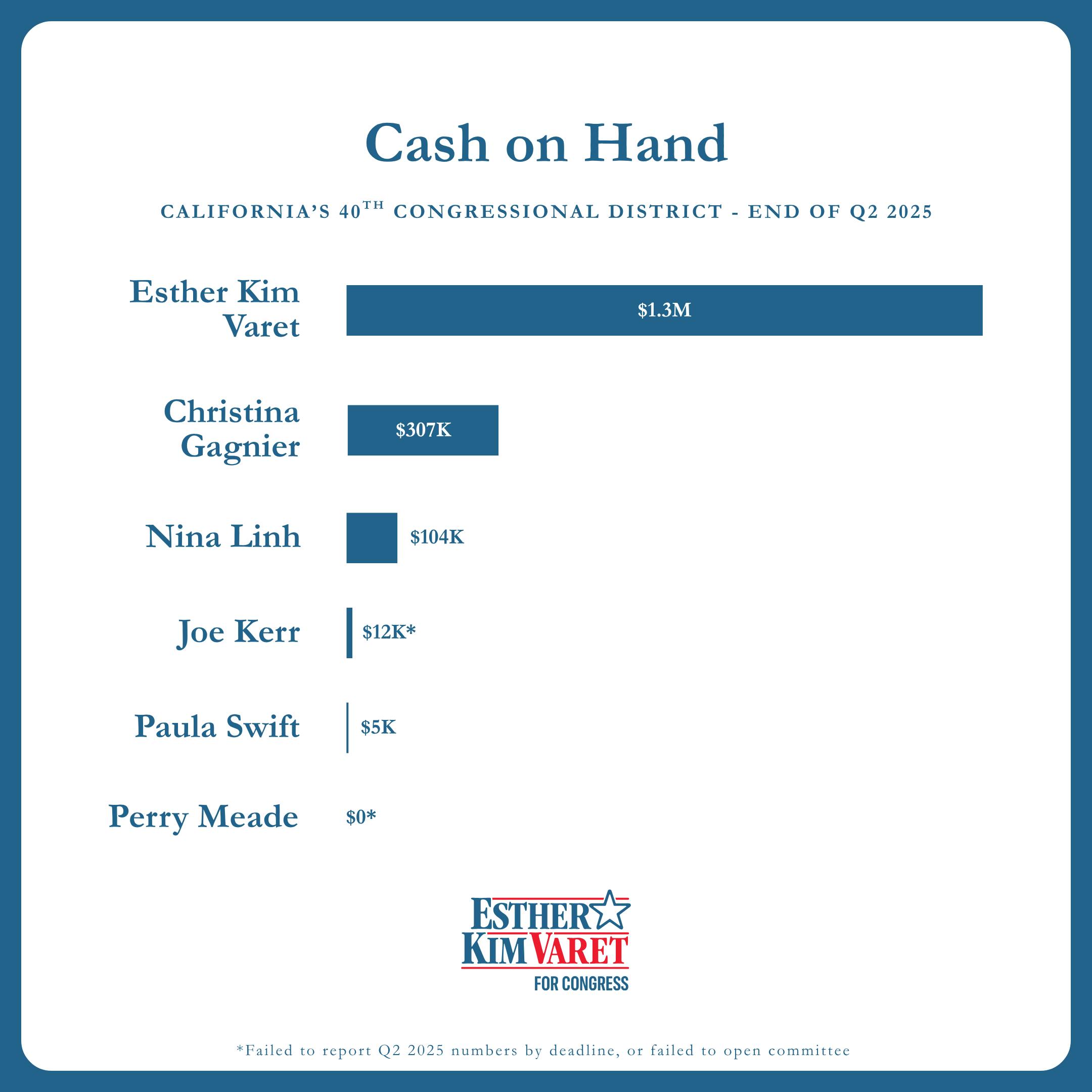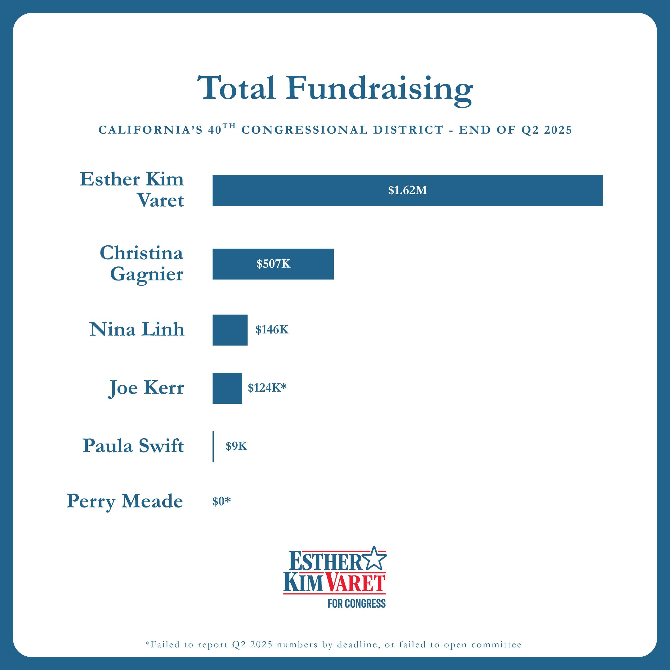 Tustin, CA – Today, CA-40 mom and small business owner Esther Kim Varet announced that in the race to unseat MAGA Republican Young Kim - as of the end of Q2 2025 - she has:
