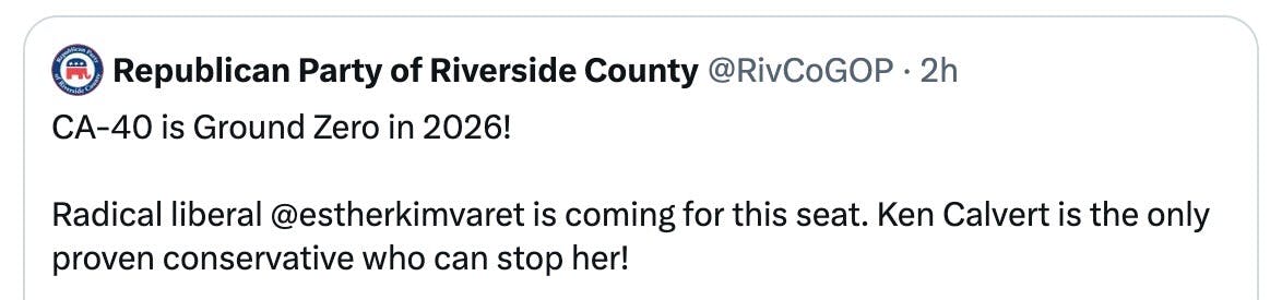 This week, the Republican Party of Riverside County warned members across all of its communication channels that “radical liberal” Esther Kim-Varet “is coming for this seat” and called on Republicans to rally around Ken Calvert as the only person who can “stop her.” Republicans have read the Tulchin poll. They have read the FEC filings. They know which Democrat is the threat.