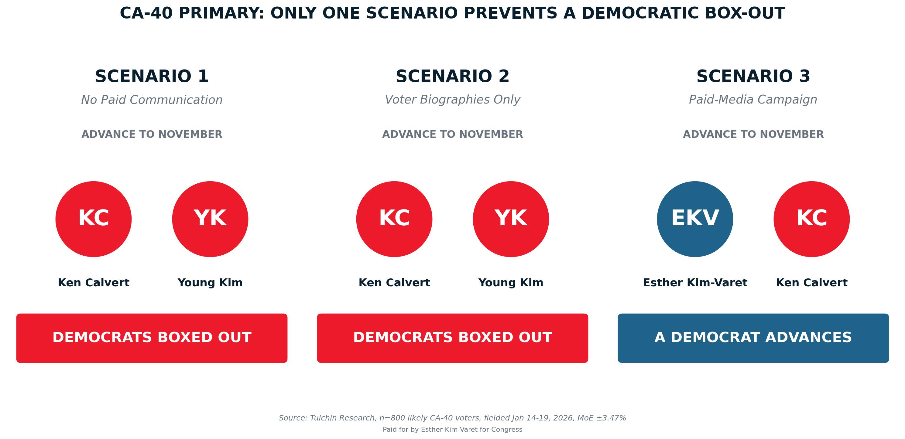 Scenario 3: Esther Kim-Varet is the only challenger candidate with a paid-media campaign, communicating her bio and messaging to likely primary voters. Kim-Varet rises to get 30% of the vote. Calvert is statistically tied with Kim-Varet for first place at 29%. Young Kim collapses to 20% and is displaced from November, outside the margin of error. This is the only scenario per the poll in which any Democrat makes the November ballot, and this is the exact scenario now playing out in CA-40. Kim-Varet is the only Democrat in the race with a paid media campaign or the resources to deploy one.